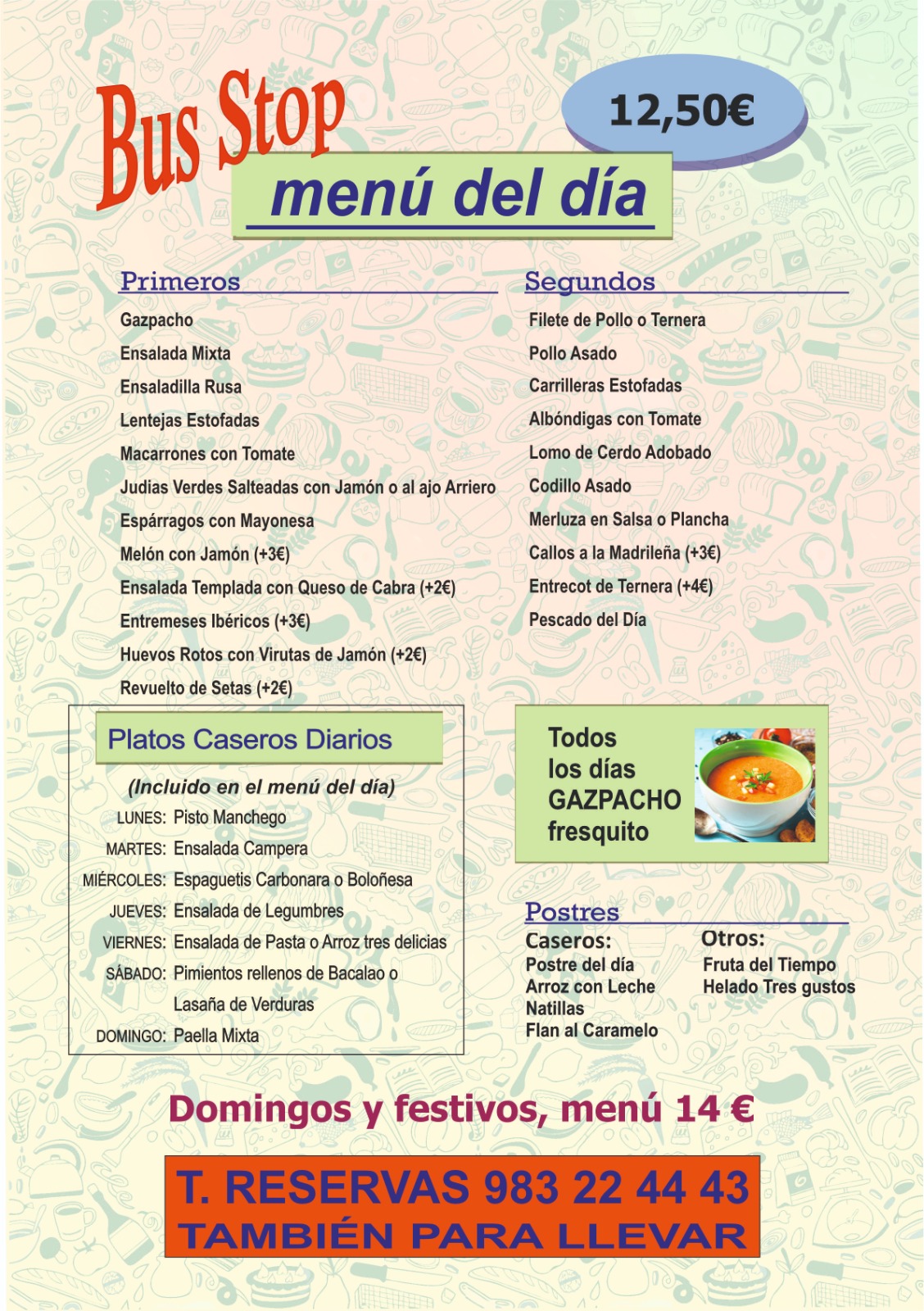 En Bus Stop puedes disfrutar de nuestro menú del día en la estación de buses de Valladolid o encargándolo para llevar por un precio inigualable.